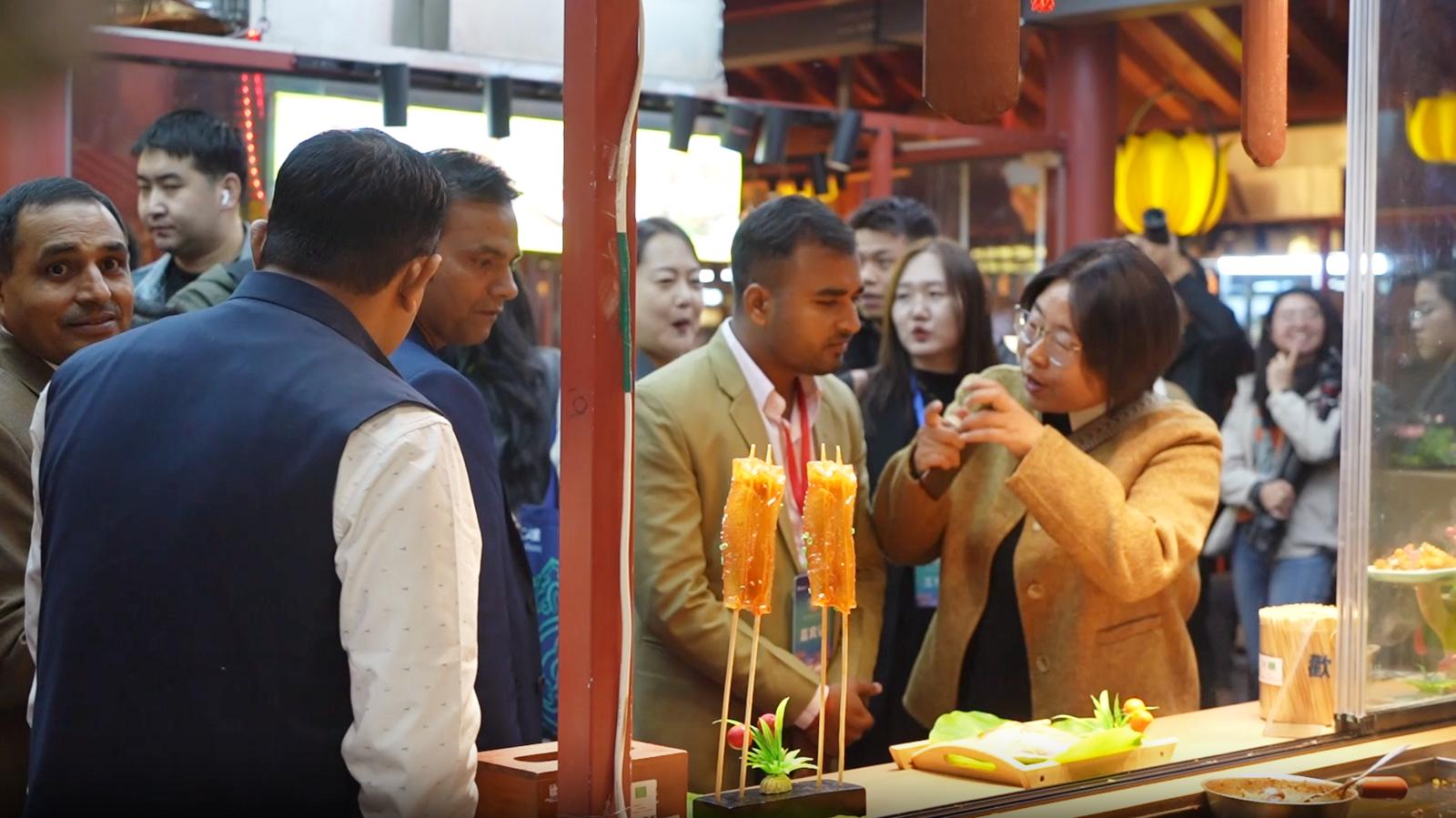 在敦煌夜市,外宾们品尝了烤肉、杏皮茶及敦煌葡萄等特色美食、水果,大家对敦煌的美食和水果赞不绝口。当晚,恰逢街头路演奏响欢快乐声,外宾们瞬间被氛围带动,跟着节奏摇摆身姿,笑声与音乐交织。随后大家漫步夜市,仿佛进入一条会呼吸的千年画廊,各类融入敦煌元素的文创产品让嘉宾们十分着迷。大家不时驻足端详、交流讨论,全程笑意盈盈,感受着敦煌夜市独有的氛围和乐趣。