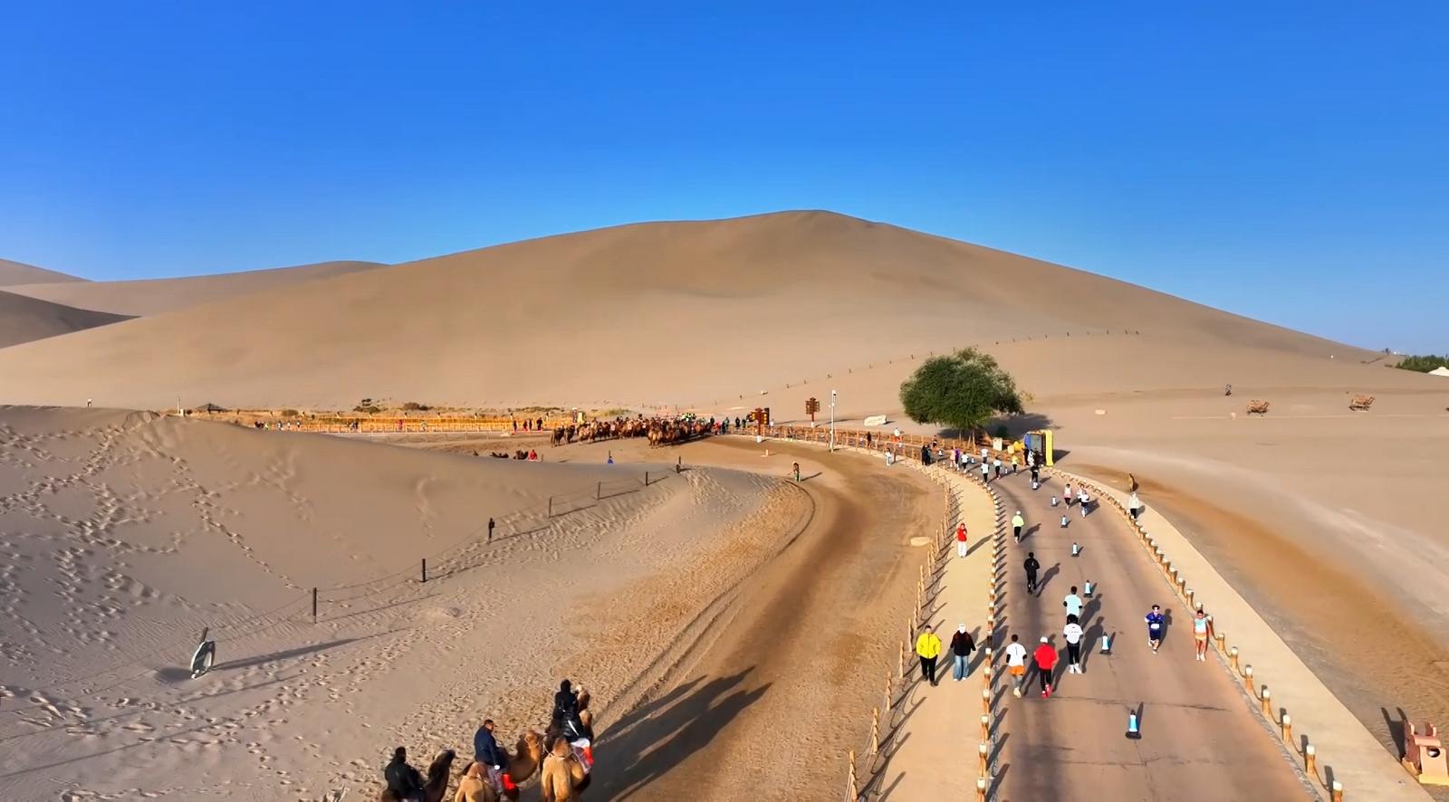 本次赛事赛道以敦煌城为画布,将地标景致串联成线。选手从起点出发,前半程穿梭市区:党河风情线的碧水漾着晨光,反弹琵琶雕塑的衣袂似随风动,现代楼宇与历史元素错落相映,参赛选手在奔跑中完成“从当下回溯历史”的奇妙穿越;后半程沿鸣山路向鸣沙山月牙泉景区延伸,赛道紧依鸣沙山边缘蜿蜒,沙粒随风轻响,仿佛古丝路的驼铃声穿越时空而来。“鹿”跑挑战赛则在效谷西路温情收官,整条路线经繁华市井烟火,让参赛选手沉浸式触摸敦煌的城市脉络。