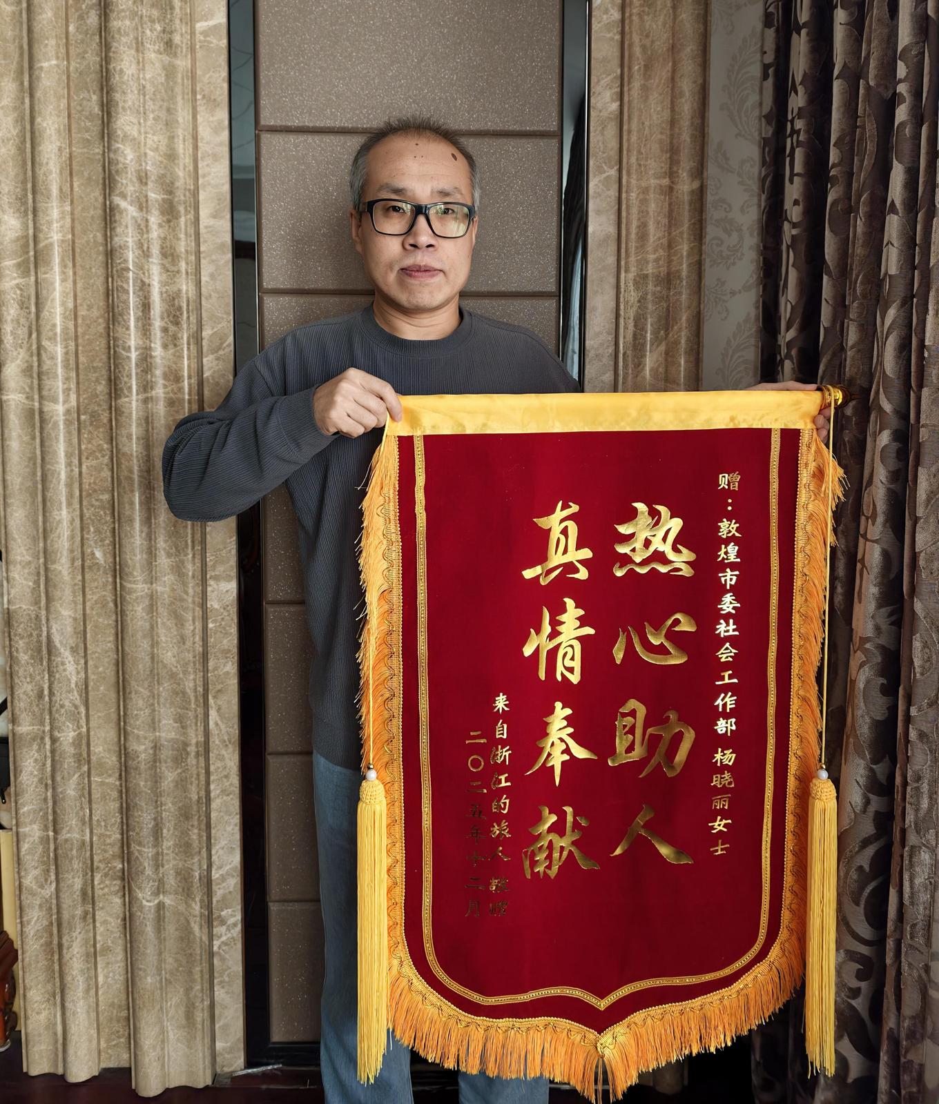 敦煌市委社会工作部副部长杨晓丽说:“这些本就是我作为志愿者该做的事,守护游客安全、帮大家解决实际问题,本就是我的分内之责。后来收到林先生一家送来的锦旗和感谢信时,我心里满是意外,不过是一件我觉得再平常不过的小事,他们却记了这么久。锦旗上“热心助人,真情奉献”这八个字,更是让我深受触动。于我而言,这算不上什么值得夸耀的功劳,只是尽了自己应尽的本分,但这份沉甸甸的认可,却成了我最珍贵的鼓励。未来,我也会带着这份温暖,更用心地做好志愿服务。”