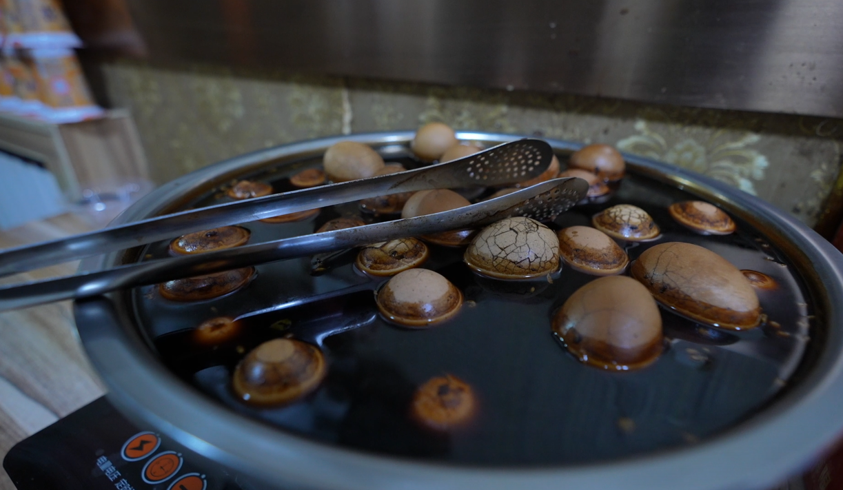 随着他们忙碌的身影,天空也日渐泛白,到七点多的时候,便有市民游客过来吃早点。这家店不大,占地十几平方米,两张窄桌子,一张靠墙的小桌,豆浆、小米粥、茶叶蛋摆在墙边,菜单贴在墙上,结账靠自觉,从取餐到离开,全程自助。