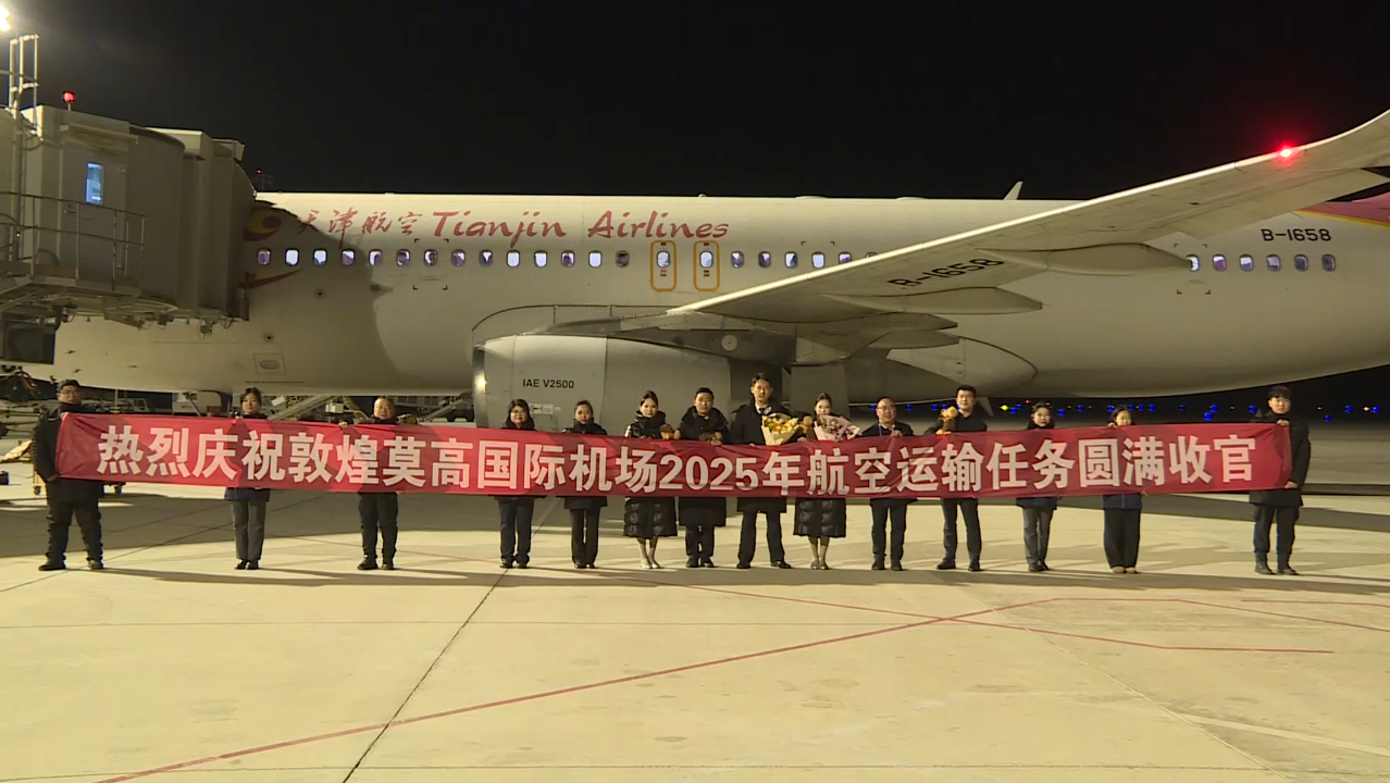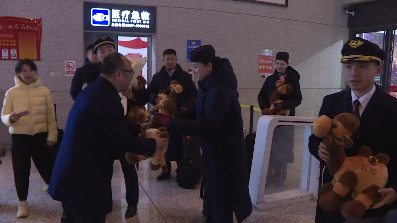 2025年收官航班为天津航空GS7592(敦煌—乌鲁木齐),机场代表为机组送上敦煌文创产品与鲜花,致谢一路坚守。2026年首日凌晨,东方航空MU2416(兰州—敦煌)航班平稳降落,成为新年首班进港航班,机场团队同步送上文创与新春祝福,见证新程启幕。