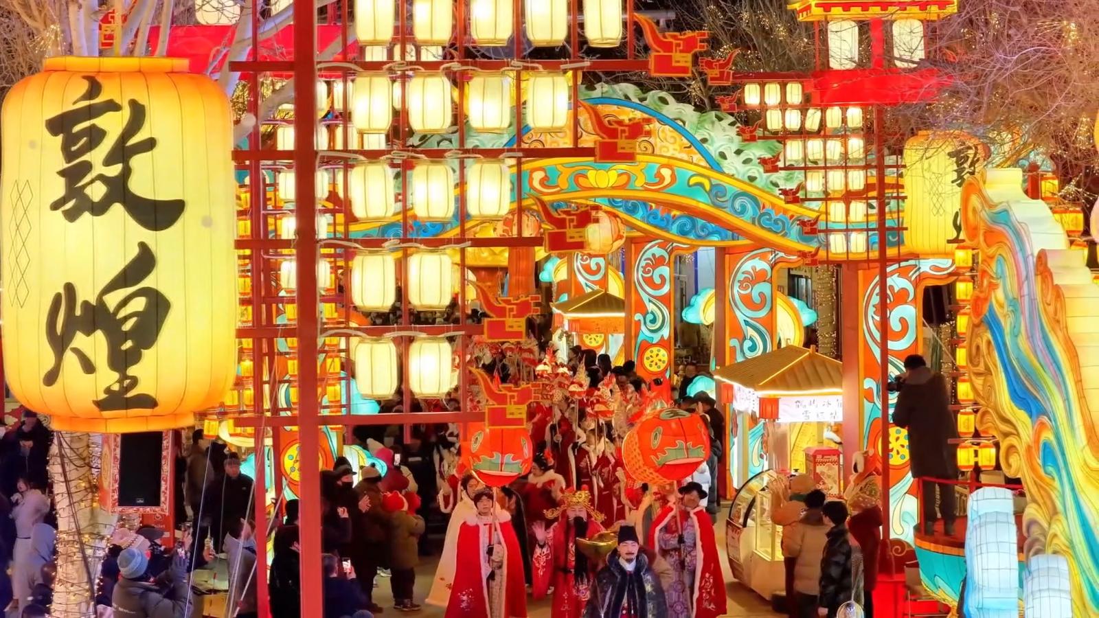 闹社火、逛灯会,是敦煌春节文化活动里的民俗标配。“千年华彩・盛世敦煌”2026敦煌灯会亮灯启幕后,凭借独具韵味的敦煌风情成为丝路之上亮眼的文旅地标,市民游客徜徉灯海,沉浸式感受千年敦煌文明与现代光影技术碰撞出的惊艳火花。这场冬春文旅盛宴以“飞天揽月、大漠华章、十二辰光”为核心脉络,22组大型主题灯组错落排布,1200余盏特色花灯流光溢彩,层层铺展间,将敦煌深厚的历史底蕴、璀璨的艺术精髓与浪漫的丝路意境诠释得淋漓尽致。本次敦煌灯会将持续至元宵节,新春佳节期间,市民游客可尽情流连灯海,邂逅独属于敦煌的新春文化盛宴,在流光溢彩中品味别样年味。