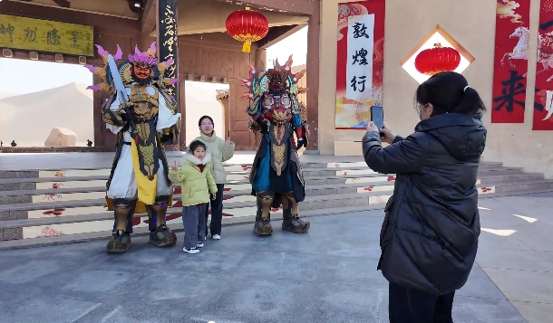 据了解,新春迎宾活动自2月17日起将持续至元宵节,每天下午都会在景区内组织NPC与游客互动,后续还将推出舞龙舞狮等民俗展演。通过传统文化与现代创意相结合,打造沉浸式旅游体验,让更多游客在领略大漠风光的同时,尽享丝路敦煌的独特年味。
