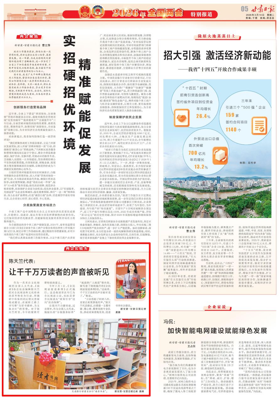 “立法搭起了四梁八柱,更要让政策落地有声。”陈天竺代表建议,应搭建一支懂书籍、懂心理、懂策划的专业队伍,推动政策落地见效,促进书香社会建设。(新甘肃·甘肃日报记者 孟捷)