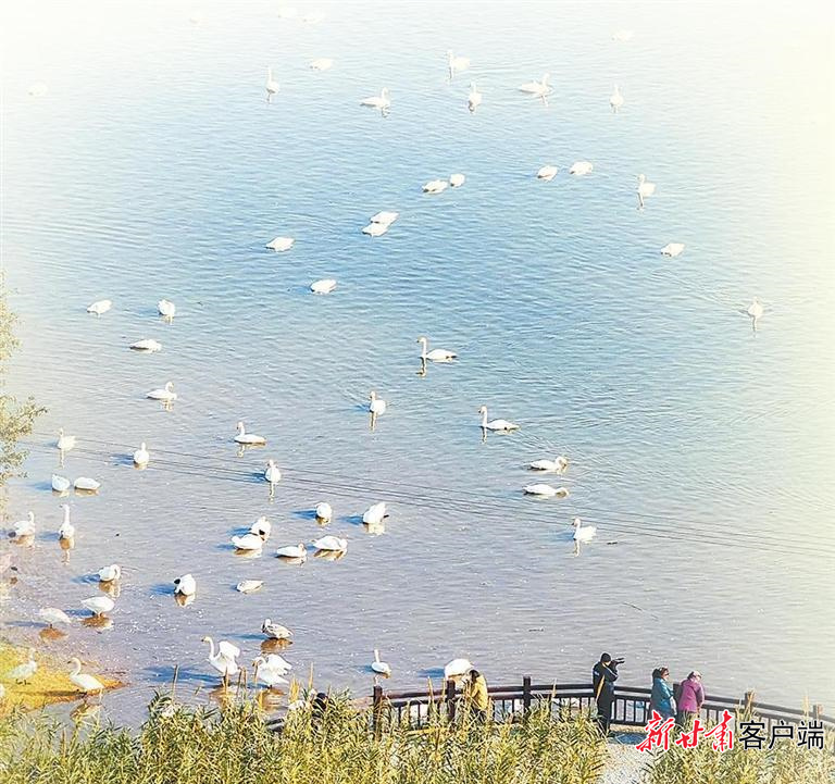 河南三门峡黄河湿地灵宝段千余只大天鹅在湿地水域中游弋、嬉戏。河南日报供图