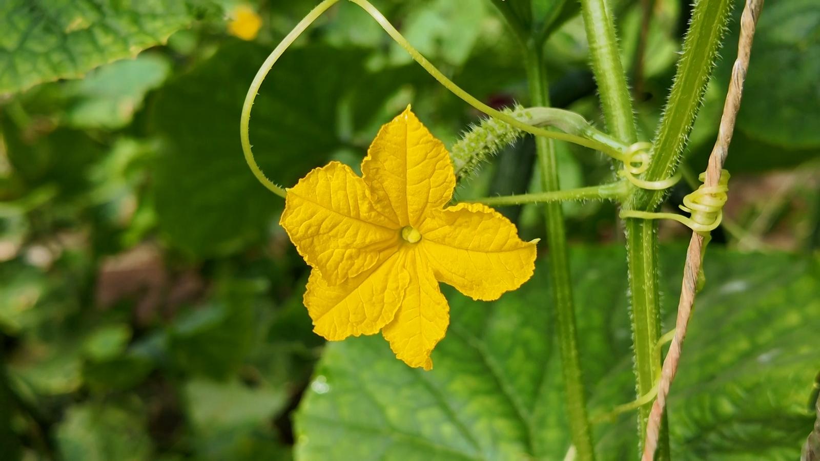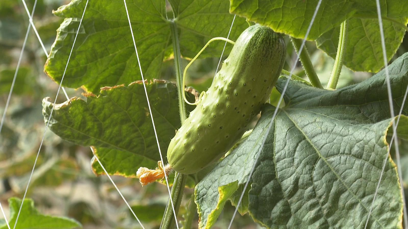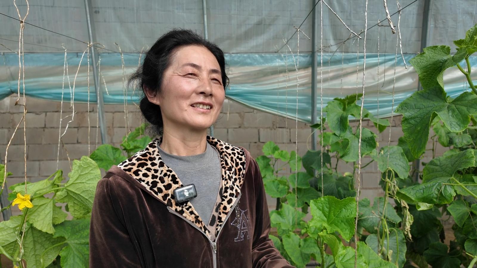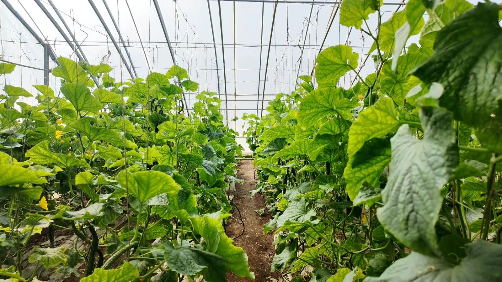 走进种植户任国玲的温室大棚,映入眼帘的是黄瓜藤蔓相互缠绕,枝繁叶茂,一根根黄瓜悬挂在藤蔓间,青翠欲滴,饱满诱人,她穿梭在藤蔓丛中,忙着采摘丰收的硕果。