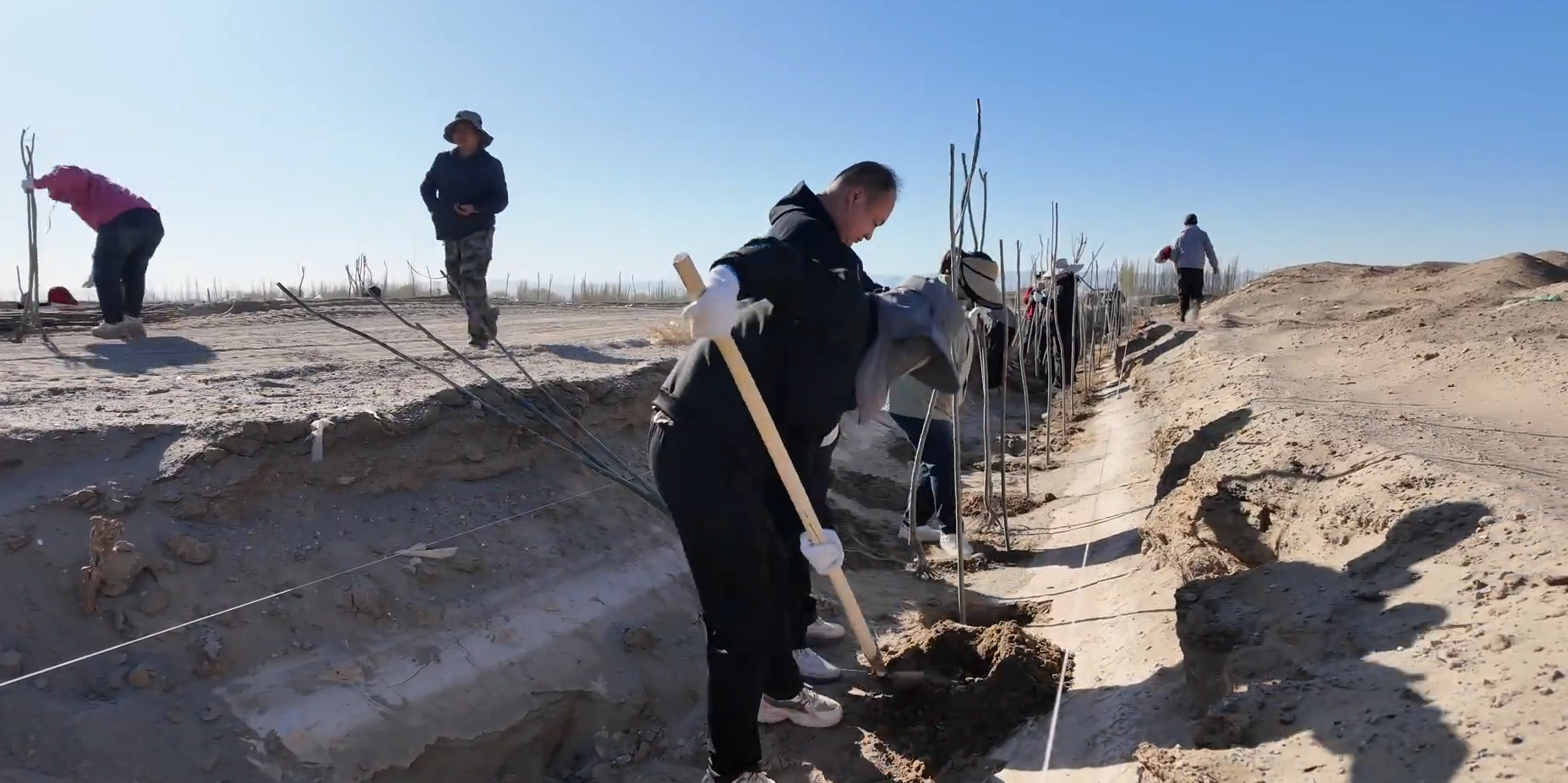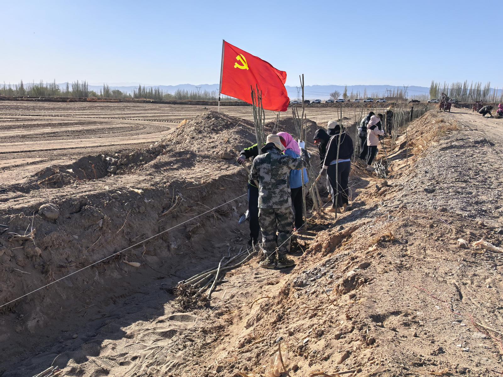 活动现场,大家分工协作、默契配合,挥锹培土、扶苗定植,各个环节井然有序,现场呈现出热火朝天的劳动氛围。此次植树重点围绕高标准农田防风林带建设,进一步加密加固林网结构,有效提升防风固沙、抵御自然灾害能力。