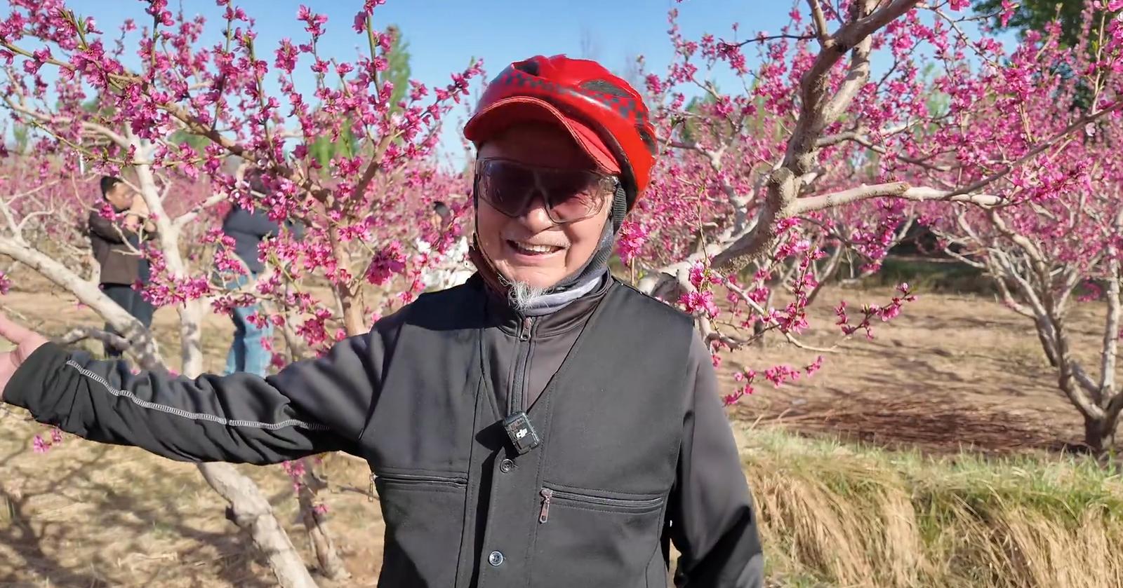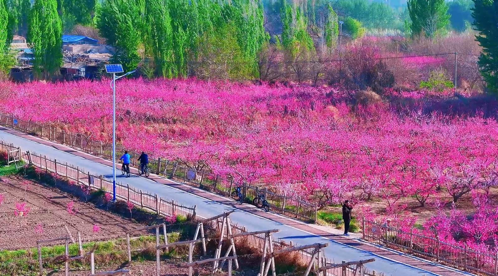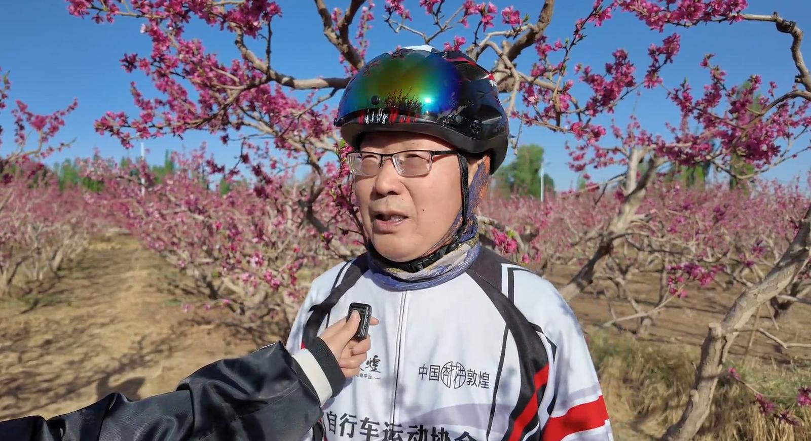 敦煌市民张彦才说:“风吹大地绿莹莹,雨打桃花花更红。今天我们骑行近40公里,特意来到这里赏桃花。大家都要拍一下桃花,你看这桃花开得多好看,我们心情都特别开心!”