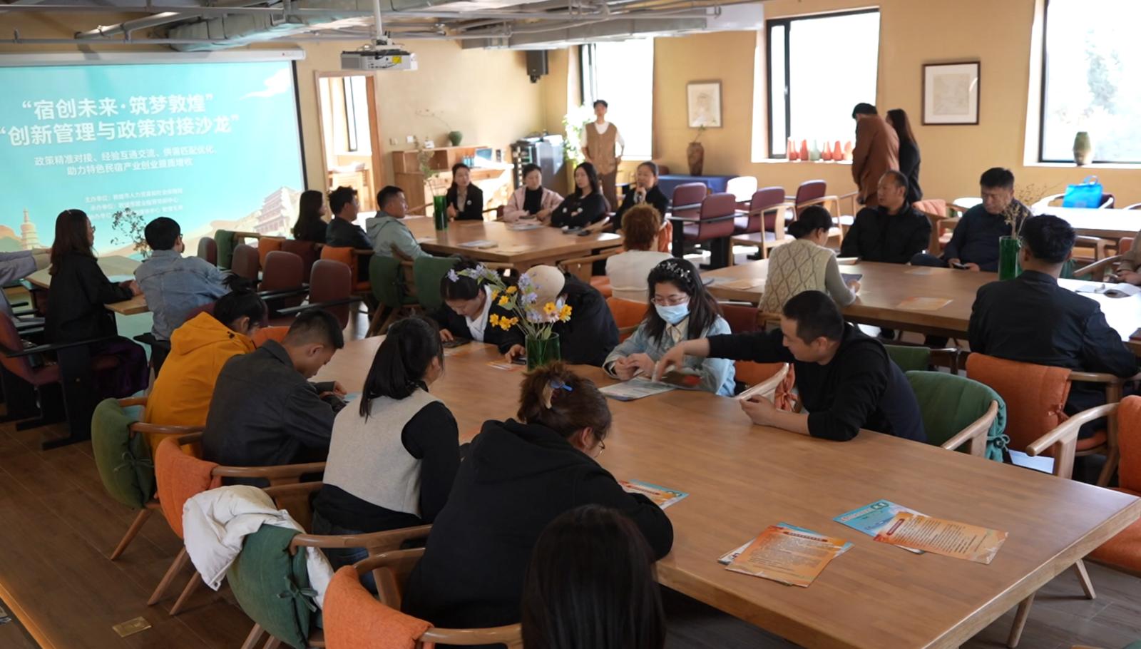 随后,“宿创未来·筑梦敦煌”创新管理与政策对接沙龙顺利开展。6位来自精品民宿、农文旅融合等领域的创业代表依次分享创业历程与运营实战经验。敦煌市就业指导培训中心工作人员现场系统解读创业就业扶持政策,并发放相关宣传资料。在互动问答与自由交流环节,各位创业者围绕政策落实、资源对接等话题深入交流探讨。通过政企面对面沟通对接,有效打通政策落地“最后一公里”,进一步提振了创业者发展信心,增强了创业获得感。