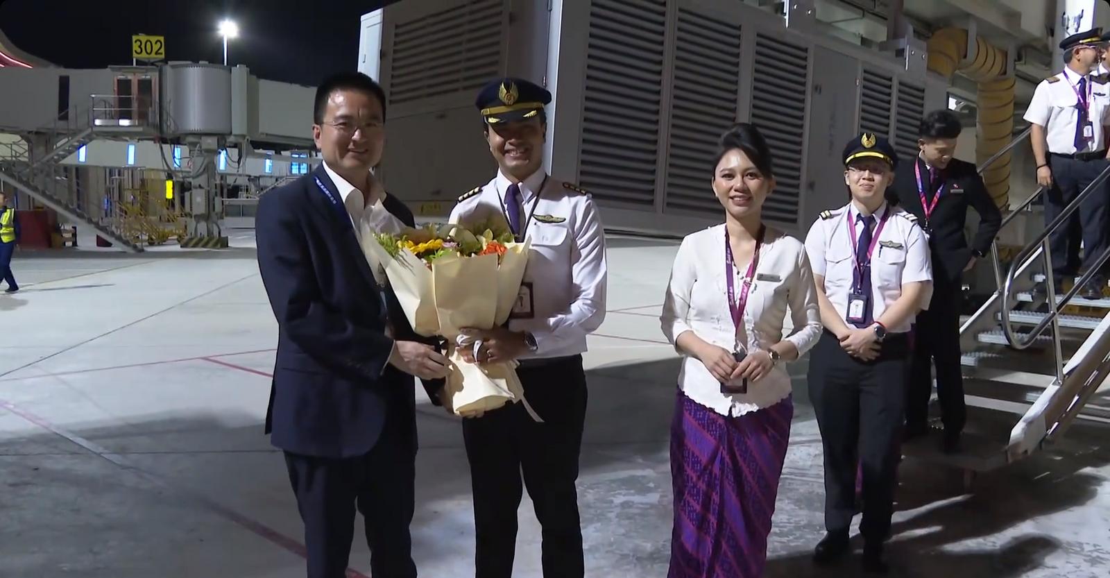 敦煌莫高国际机场举行了简短的复航仪式,为该航班机长、乘务组赠送复航纪念品并合影,共同见证这一跨国文旅交流的重要时刻。