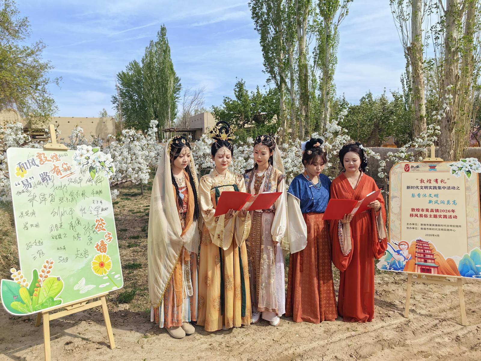 在敦煌市莫高镇举办的2026年“花开敦煌 和美莫高”梨花乡村旅游系列活动中,将移风易俗的文明课堂搬进梨花活动的花海之中。梨花树下,身着汉服的梨花仙子盛装亮相,深情诵读《文明新风润莫高》等作品,将厚养薄葬、婚事新办、丧事简办等内容融入诗词朗诵。“抵制高额彩礼”打造文明新风,在有奖猜谜区,100余条谜语巧妙融入文明节俭、绿色祭扫、文明出行等内容,游客们纷纷驻足参与,或低头思考、或共同探讨,欢声笑语中,文明的火种悄然播撒进群众心田,群众纷纷在移风易俗签名墙上签名,许下深化移风易俗、弘扬文明新风的承诺。